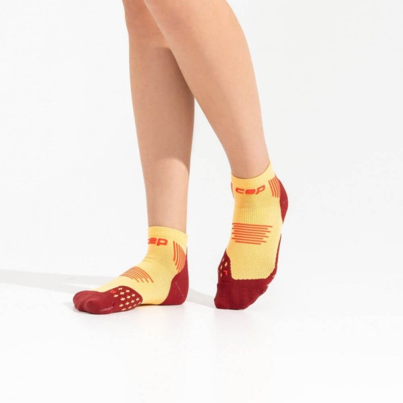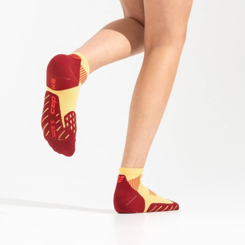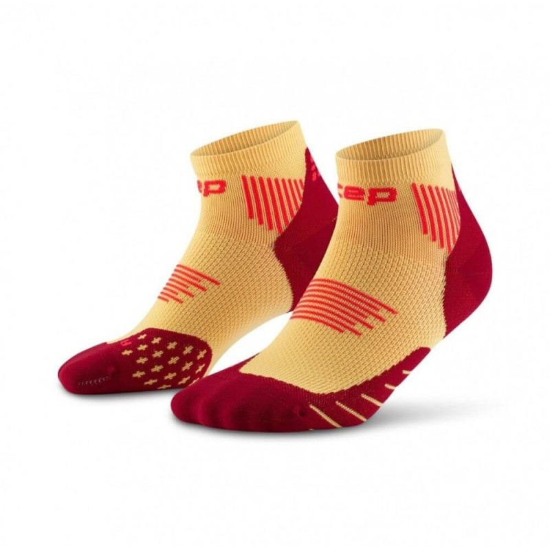 Женские компрессионные короткие носки CEP арт. C095W-YB, цвет желтый-бордовыйизготовлены из высокотехнологичных материалов по технологии круговой вязки, используются в различных спортивных дисциплинах для достижения максимального комфорта при тренировках, способствуют снижению риска получения травм. Благодаря анатомической посадке носки отлично сидят на ноге, не сползают, не натирают. Поддерживающая компрессия улучшает циркуляцию крови в стопе и предотвращает образование отеков во время тренировок. Специальные технологии влагоотведения и терморегуляции обеспечивают сухость ног в любую погоду. Подошва носков имеет хорошее сцепление с обувью, что повышает устойчивость при движении.