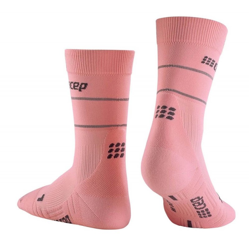 Женские компрессионные носки CEP Reflective арт. C103RW-4, цвет розовый спортивные носки со специальной светоотражающей нитью по кругу изделия, которая выделяет спортсмена во время тренировок в темное время суток, обеспечивая дополнительную видимость и безопасность. Носки изготовлены из высокотехнологичных материалов по технологии круговой вязки. Асимметричный носок и усовершенствованная конструкция создают более совершенную анатомическую посадку, носки отлично сидят на ноге, не сползают, не натирают. Поддерживающая компрессия улучшает циркуляцию крови в стопе и предотвращает образование отеков во время использования. Специальные технологии влагоотведения и терморегуляции обеспечивают сухость ног в любую погоду