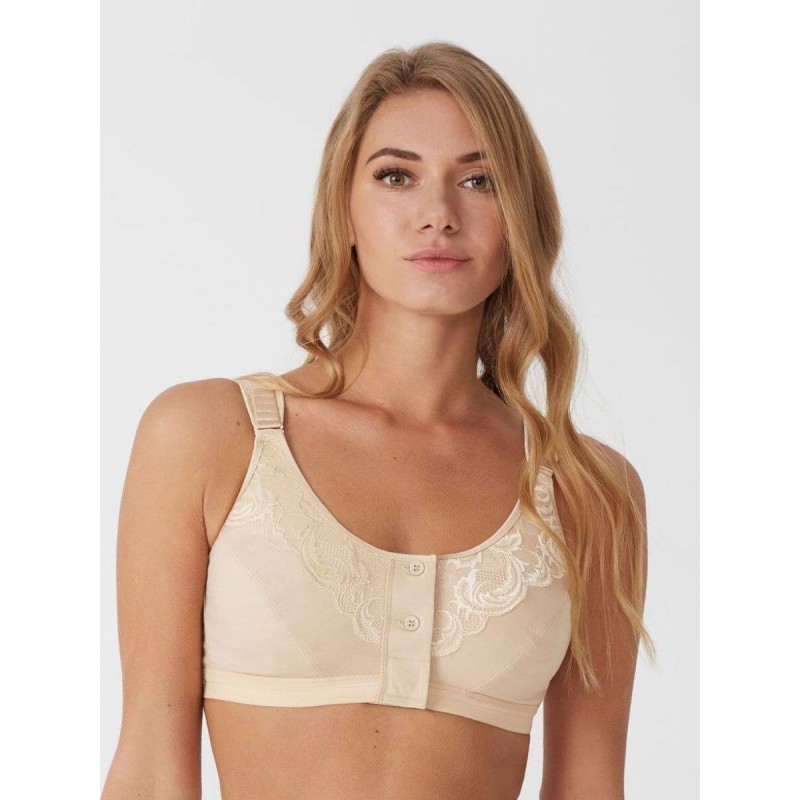 Послеоперационный хлопковый бюстгальтер Confidence Polonaise 1104 цвета латте рекомендован для использования сразу после операции или во время прохождения лучевой терапии. Бюстгальтер украшен мягким кружевом, хлопковые кармашки предназначены как для текстильных протезов, так и для силиконовых накладок и протезов.