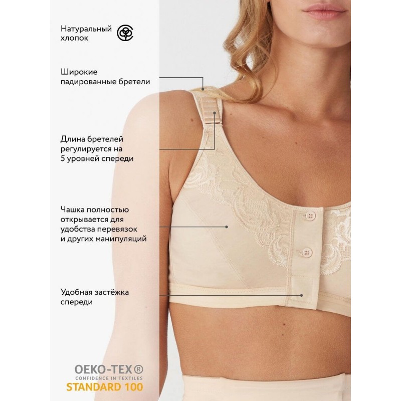 При изготовлении бюстгальтера применяются только плоские швы, нет фурнитуры на спинке изделия, что позволяет комфортно использовать бюстгальтер особенно в ранний послеоперационный период.