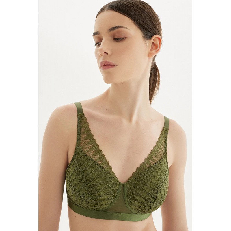 Бюстгальтер Megami Fashion арт. M9109, цвет оливковый – бюстгальтер для повседневной носки, с формованными дышащими чашками без косточек. Бретели – регулируемые, с увеличением размера становятся шире, регулятор с зубчатым краем четко фиксирует установленную длину. Высокая спинка особой конструкции из двух слоев корсетной сетки, снимает нагрузку с плеч. Четырехуровневая застежка с закругленными краями, обеспечивает максимальный комфорт, 2 ряда крючков в маленьких размерах, 3 ряда в размерах B90, D75,80,85. Кармашки для протезов выполнены из эластичного шелковистого микроволокна, благодаря которому кожа остается сухой и не перегревается, что особенно важно для женщин после мастэктомии или реконструкции. Подходят для ношения симметричных или асимметричных протезов.